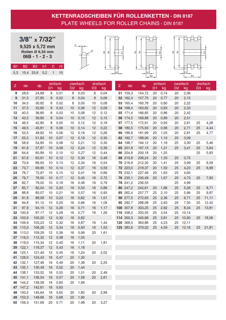 3/8” x 7/32” 9,525 x 5,72 mm Rollen Ø 6,35 mm 06B - 1 - 2 – 3